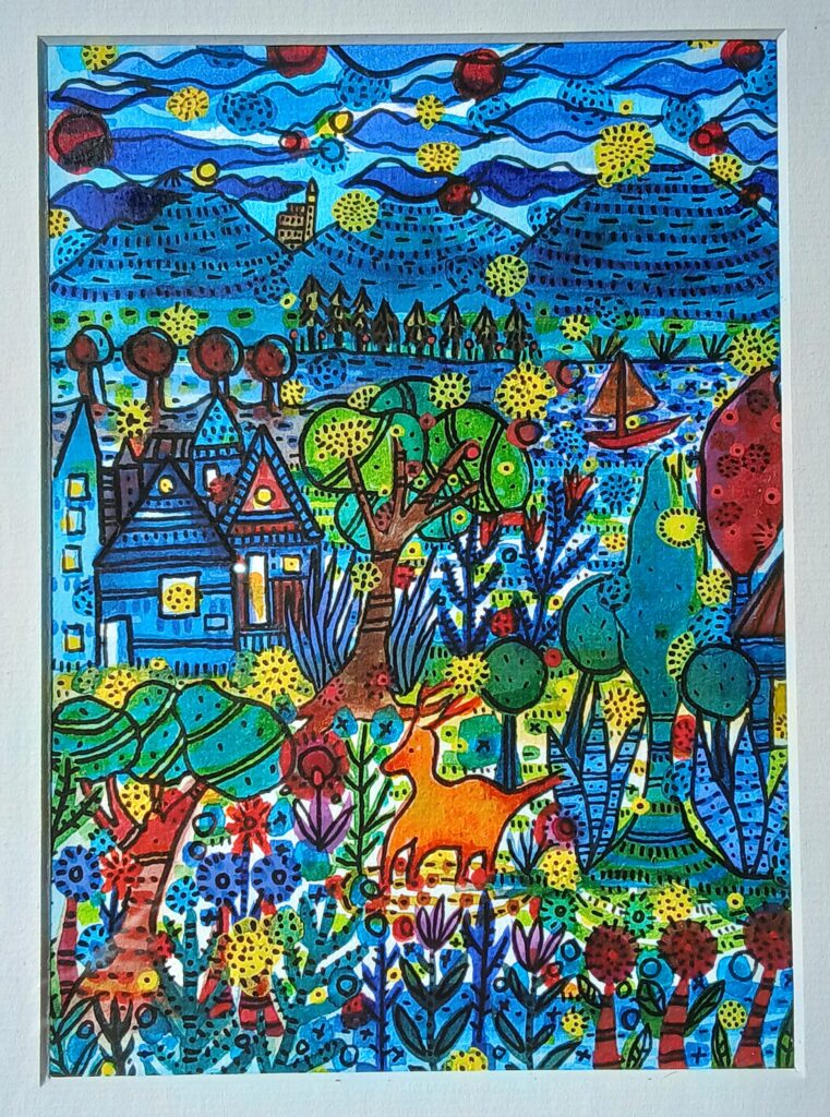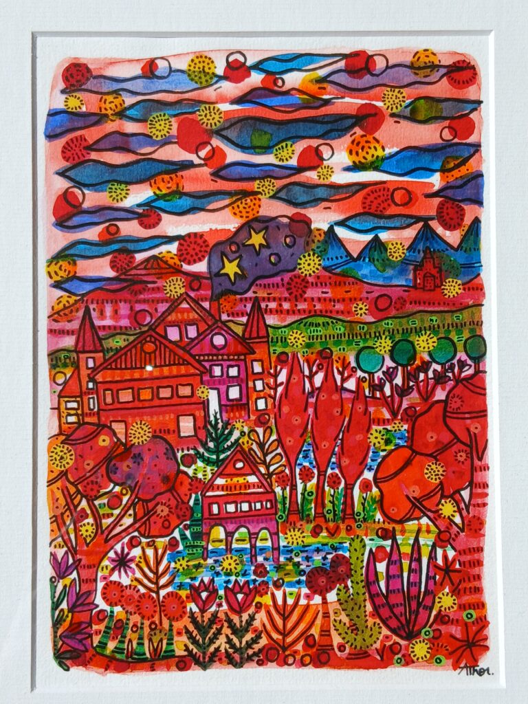 Cette série est née d’un travail sur les paysages imaginaires. Elle est réalisée à l’encre et à l’aquarelle. Les espaces figurés évoquent ceux de l’enfance et du rêve : intensité des couleurs, non-respect de la perspective, formes figuratives simplifiées….